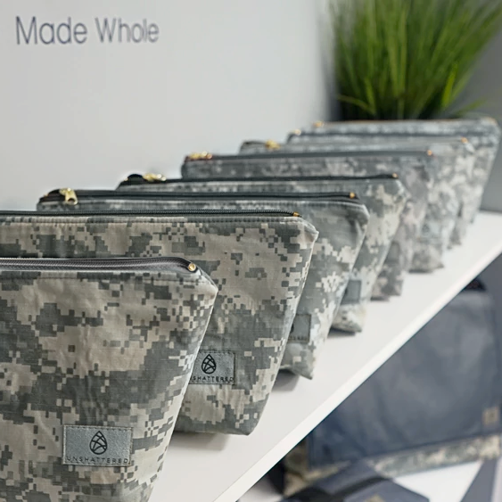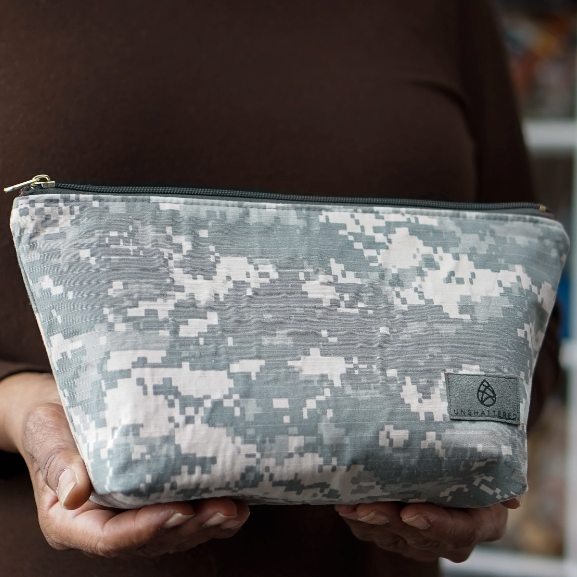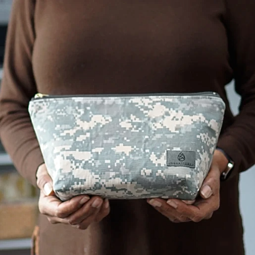 This handcrafted makeup kit is made from a retired US Army uniform. Perfect for your carrying your favorite makeup when traveling or at home, the bag is lined with Ultrafabric's wipe-clean, durable, luxury leather alternative to protect against spills.