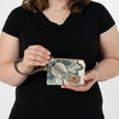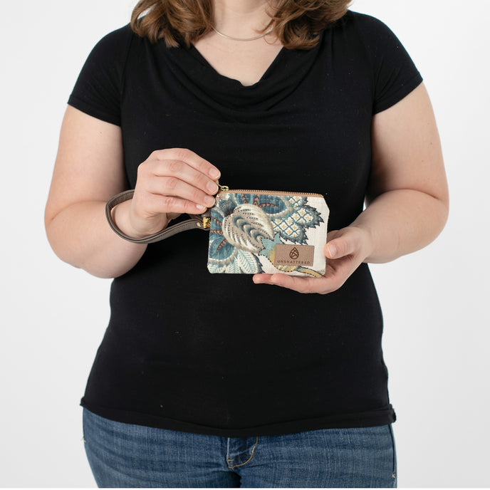 Experience luxury and style with this delightful clip pouch with lovely floral pattern. Its slim design allows for easy pocket access and has space for your ID and cards. Perfect for securing small essentials, its convenient clip attachment makes it easy to carry with the wristlet strap or attach to your bag.