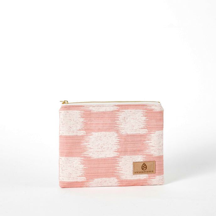 Crafted from reclaimed fabric in a delicate pastel pink-and-white pattern, every detail reflects expert craftsmanship and sustainable design.