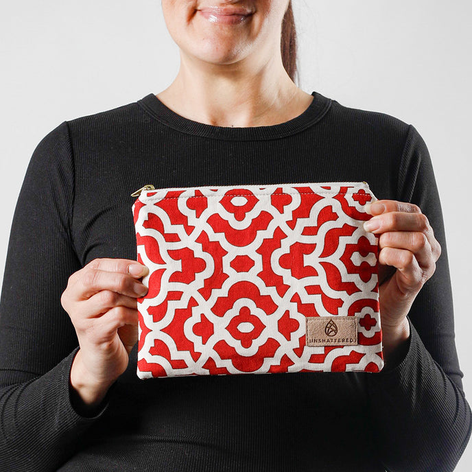 Carry purpose in your pocket with the Kesha Zip Pouch, a vibrant red and white geographic print that proves sustainable style doesn't compromise on impact. Make a statement with a zip pouch that's both visually striking and deeply meaningful.