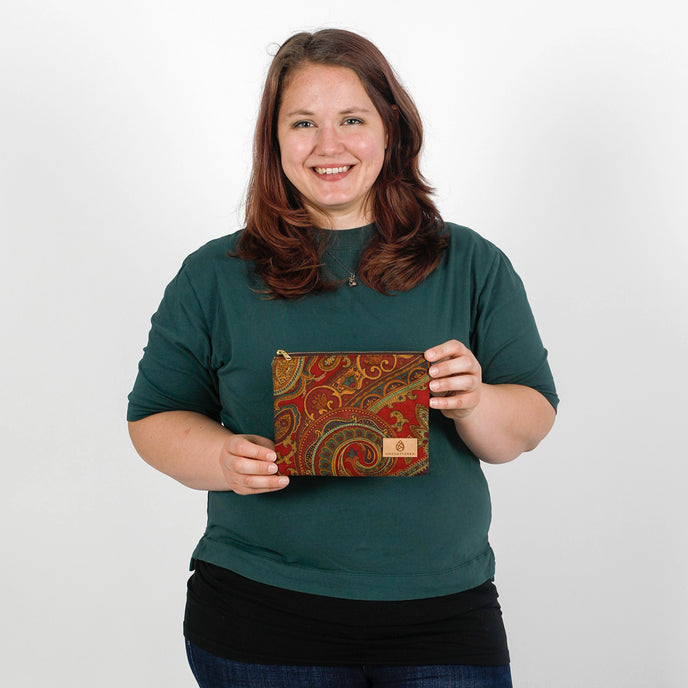 This zip pouch showcases a striking red and green paisley pattern, meticulously handcrafted from upcycled materials. This sustainable accessory offers a stylish way to organize your essentials while supporting mindful consumption. Durable and unique, it’s perfect for anyone looking to combine fashion with thoughtful choices.