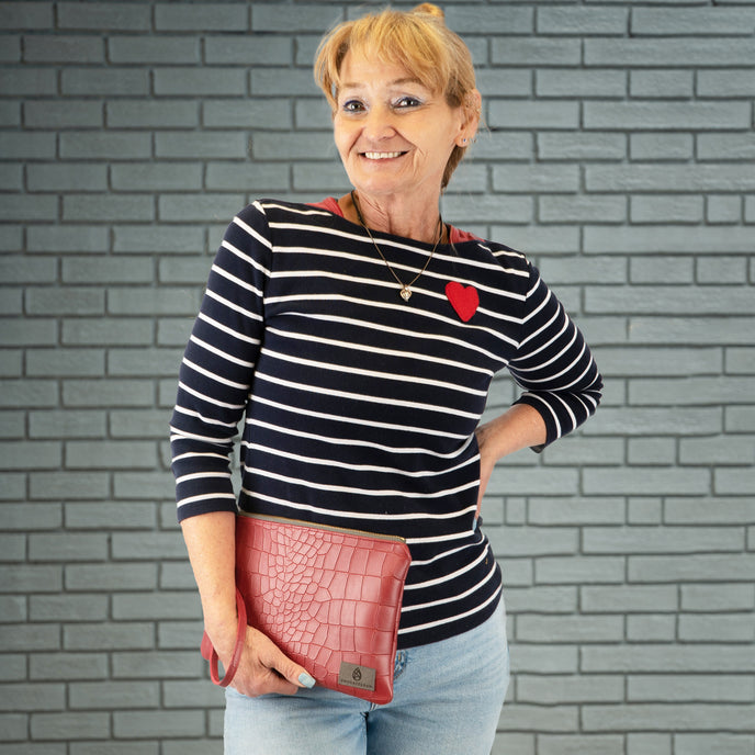 Grab this luxurious, upcycled red leather wristlet that features a stylish embossed crocodile print with a gorgeous, striped interior. It's perfect for your next hot date! Handcrafted from premium leather reclaimed from a high-end NYC manufacturer's scrap and accented with gold-tone hardware.