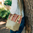 This mixed media tote is made from beautiful upcycled striped fabric that is paired with UltraFabric's premium tan luxury leather alternative. The interior liner is made from upcycled floral fabric. Handcrafted by a woman in recovery in Hudson Valley, NY, this tote gives possibilities for her to sustain her sobriety.