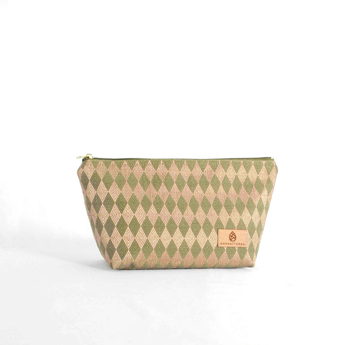 This makeup kit showcases a stylish green diamond pattern with varying shades for a modern look. Made from durable material, it offers plenty of space for your makeup and essentials. This sleek, functional bag is perfect for daily use or travel.