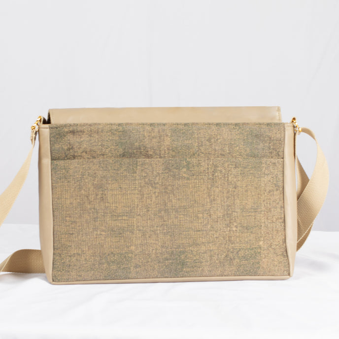 Make a statement with our messenger crafted from upcycled luxury leather alternative and upcycled fabric. This stylish and functional travel companion is just the right size for your small laptop!